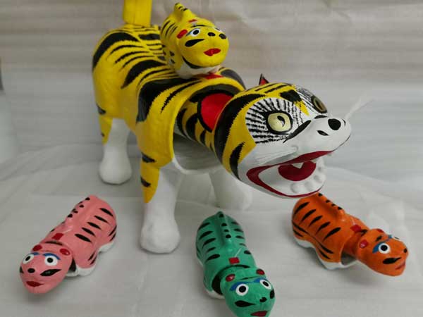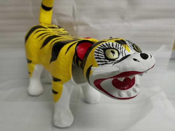 張り子の「神虎」は、大坂でコレラが流行した際、薬種仲間が病除けの薬として当時の薬種仲間が「 虎頭殺鬼雄黄圓 ことうさっきうおうえん 」という丸薬を作り、