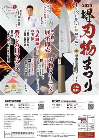 4月12日(土)~13日(日)、堺市産業振興センターにて「堺刃物まつり」が開催されます。大阪の伝統工芸品である堺打刃物、毎年大変大勢の方々がこの堺刃物まつりに来場されます。お時間があれば、一度堺にお越し頂き、活気溢れる雰囲気を感じて頂ければと思います。