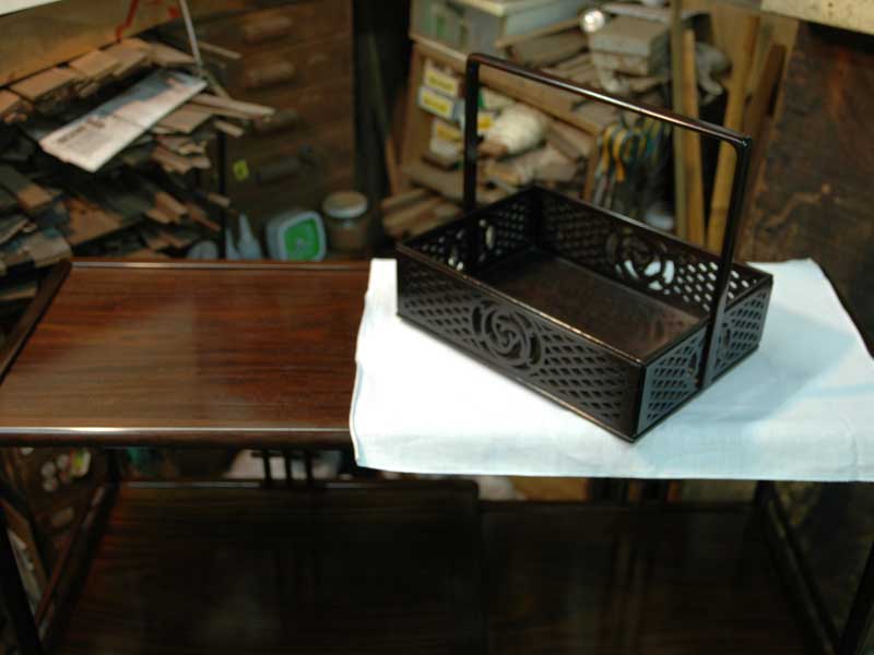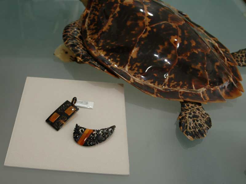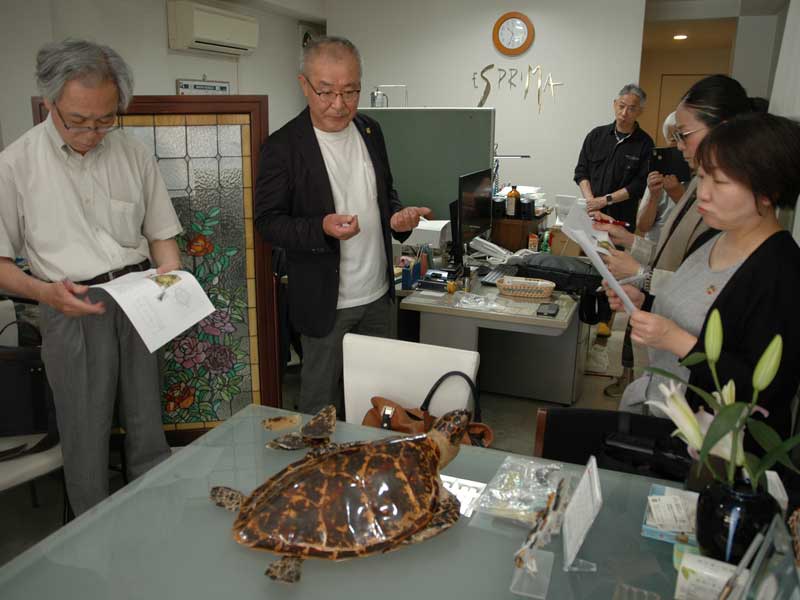べっ甲は海亀の一種タイマイ(玳瑁)の背甲(黒甲)、肚甲、爪甲(尾の回りの甲羅)を原料としますが、まずはそれぞれの部材の特徴と熱処理による加工についての説明を聞き、続いて透し彫りと研磨を見学させて頂きました。