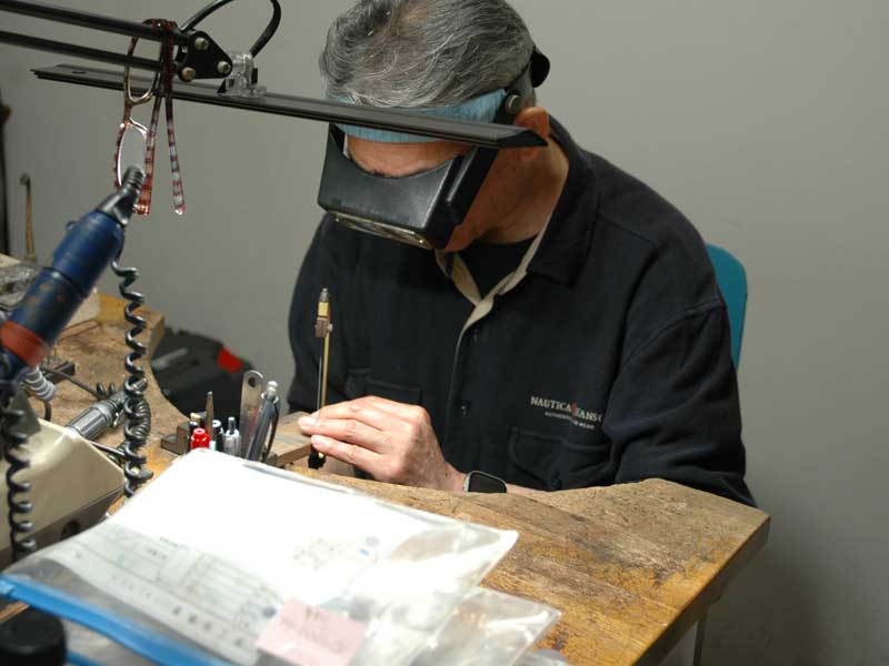 レコード盤のような平面研磨機を使って手作業でパーツの削り出しと磨きを行いますが、その精緻さは手仕事でなければ出ない精度とエッジの美しさがあります。