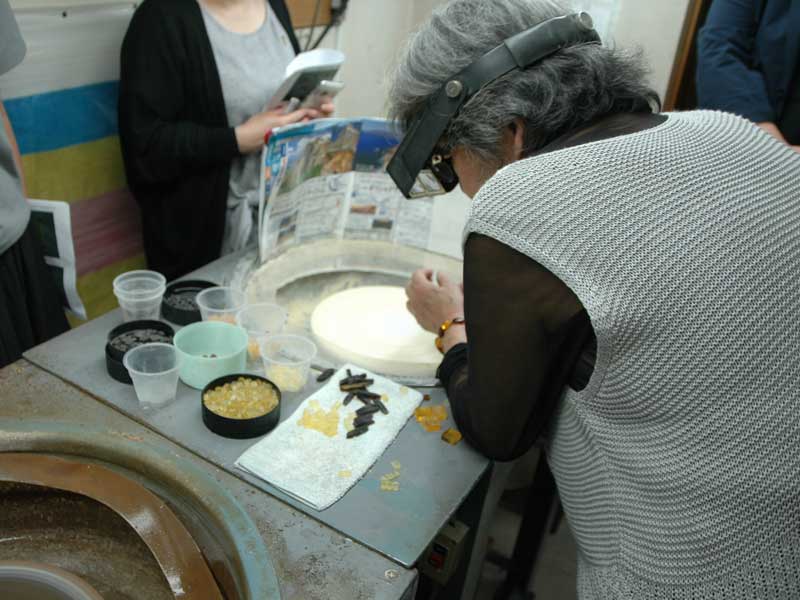 場所を移動して、琥珀の加工を手掛ける岡本カット工房様に伺い、琥珀のパーツ製作の様子を見学させて頂きました。