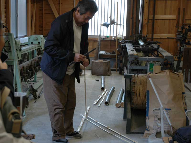 江戸時代から明治、大正時代にかけて様々な工具が考案され、生産量は増加しましたが、丁寧に節を削り、竹割からひご作りまでの工程は全て手仕事であり、またひごを一本づつ編み上げて、縁を裏表二人で縫い合わせて仕上げるまで、全ての工程が手仕事となります。