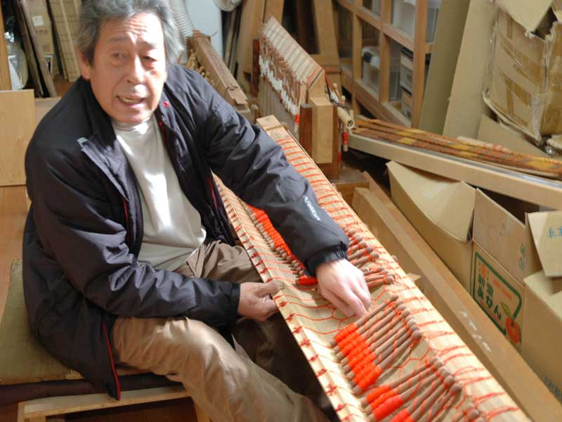 富田林では、江戸時代には既に簾の製造が盛んだったとされますが、明治時代に一気に編み上げる編み機が考案され、飛躍的に生産量が増えたとの事。簾作りは、昭和初頭まで主に海外向けに量産されましたが、第二次大戦中に生産量が一時的に低下、その後1950年代に生産量がピークを 向えて、特にビニール製簾は広く普及しました。