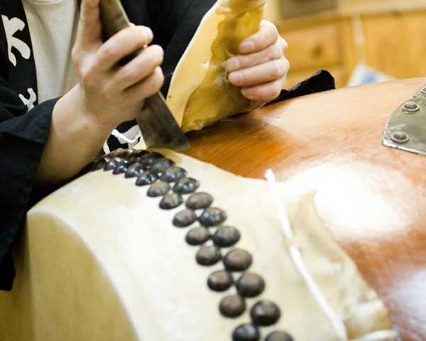 その太鼓の製造技術を受け継ぎ、今なお昔と変わらない手作業で和太鼓の製作 -音づくり- をしております。