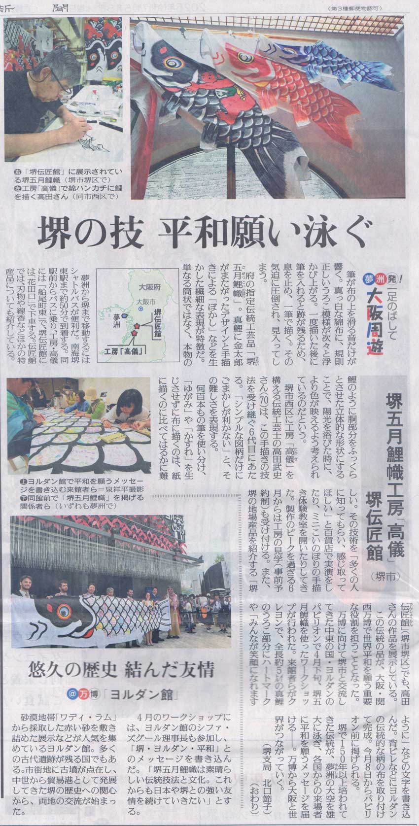 当協議会会員の「堺五月鯉幟」、堺五月鯉幟・高儀が、5月8日讀賣新聞に掲載されました。